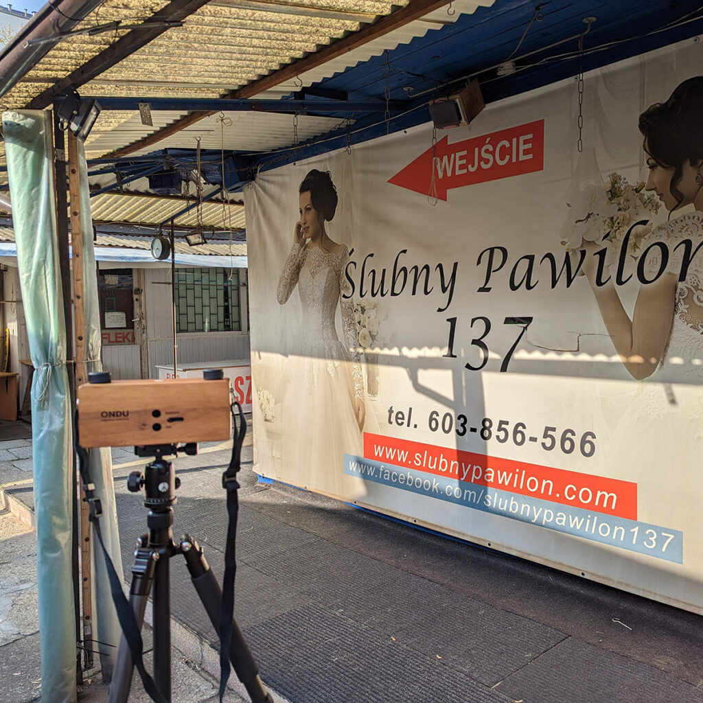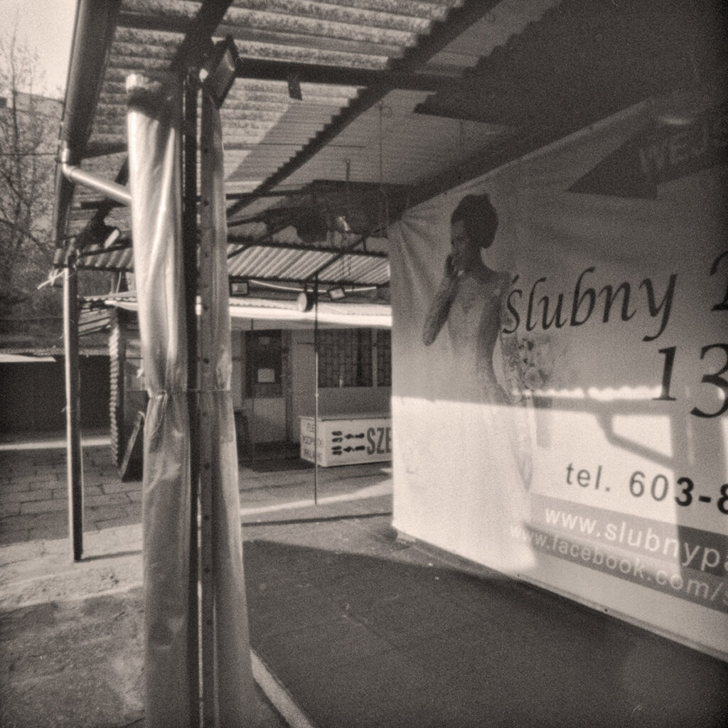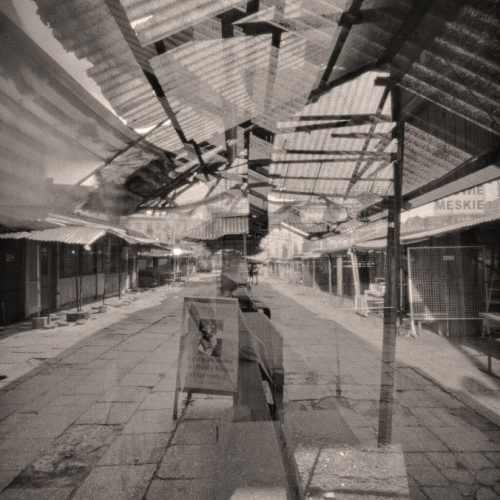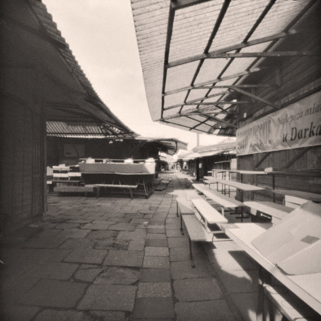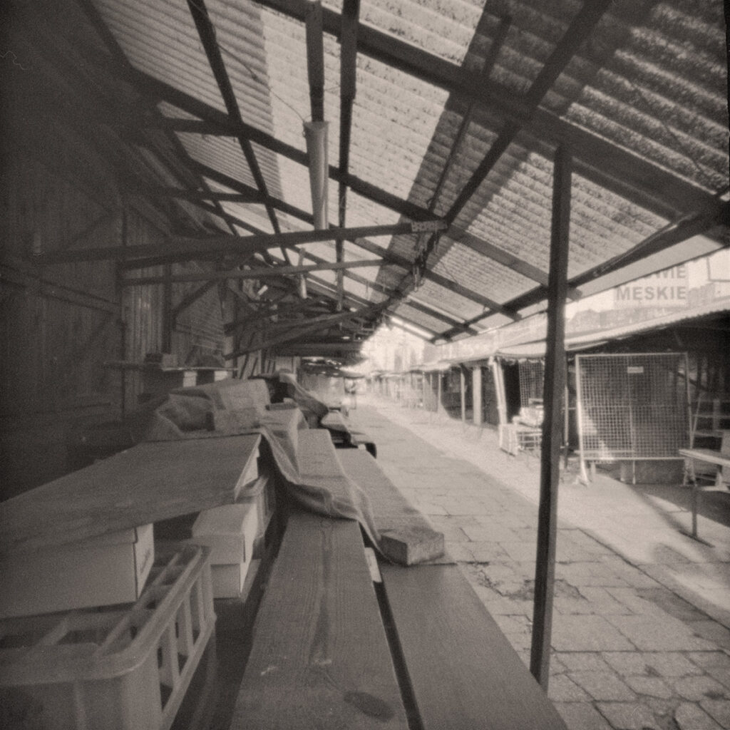 In Warschau trafen wir auf diesen Markt, der am Wochenende menschenleer war. Als ich damit begann zu fotografieren, wurde ich sofort von der Security angesprochen, denn Fotos sind hier nur mit Genehmigung erlaubt. Die Camera Obscura wirkte jedoch so skurril und harmlos, dass ich die Bildserie fortsetzen konnte.