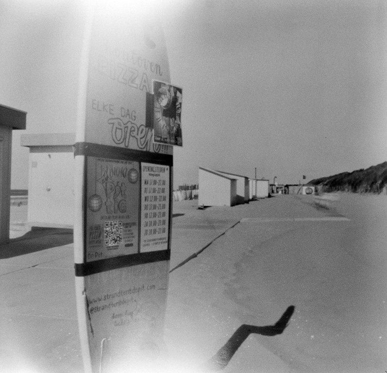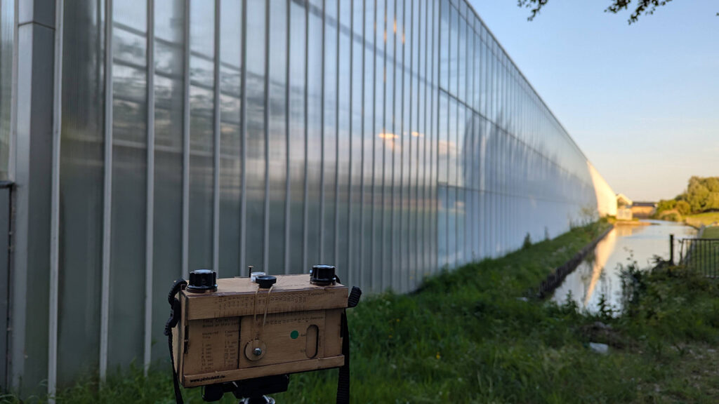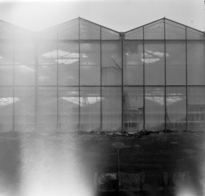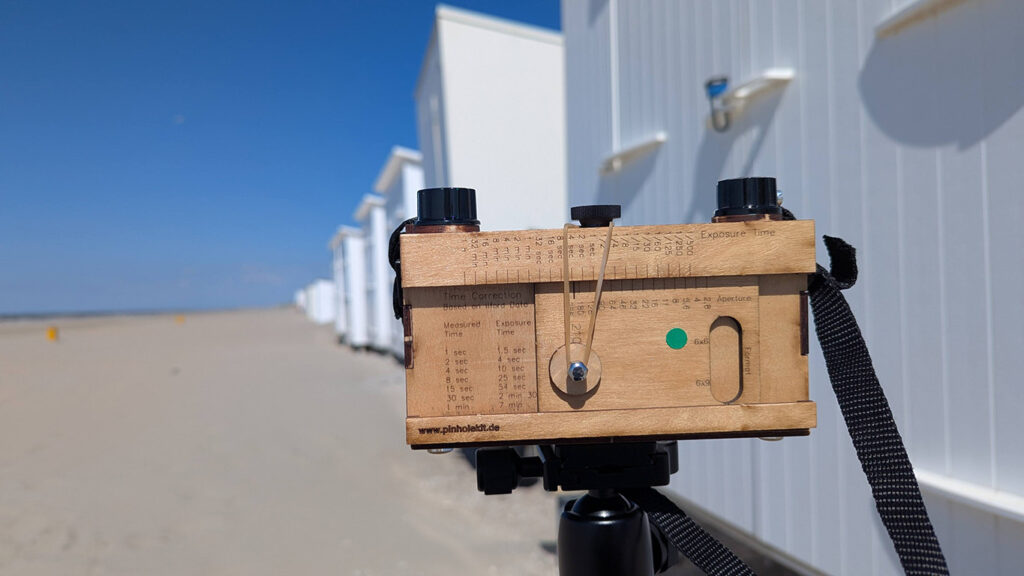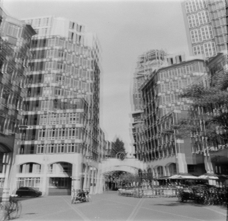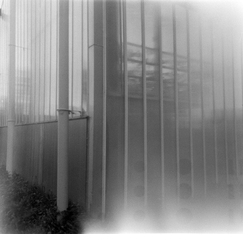 Bei der analogen Fotografie und ganz besonders bei der Fotografie mit der Kamera Obscura gehen immer wieder Dinge schief. In diesem Fall wurde ein Film in der Pinhole Kamera nicht straff genug aufgewickelt und beim Öffnen der Kamera teilweise belichtet.