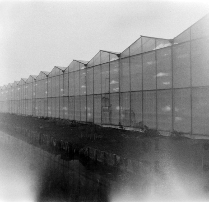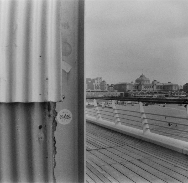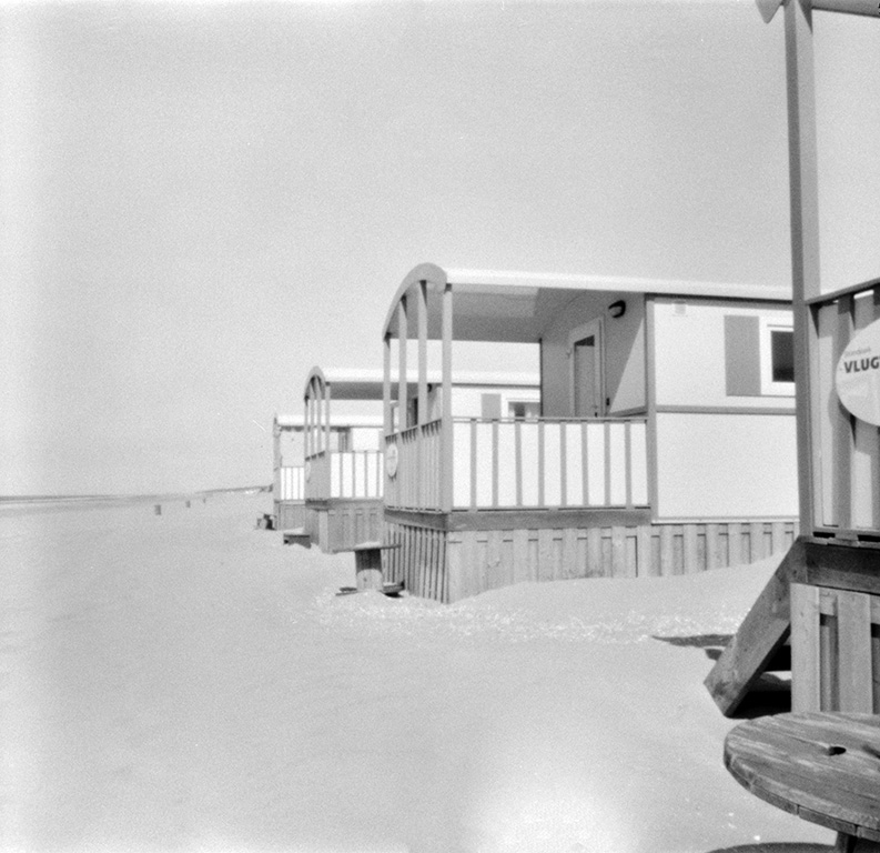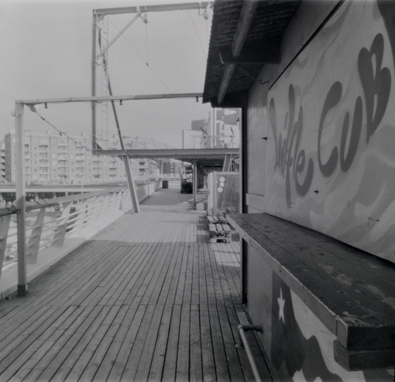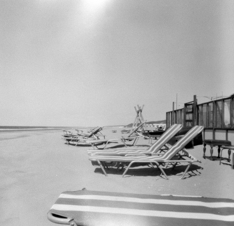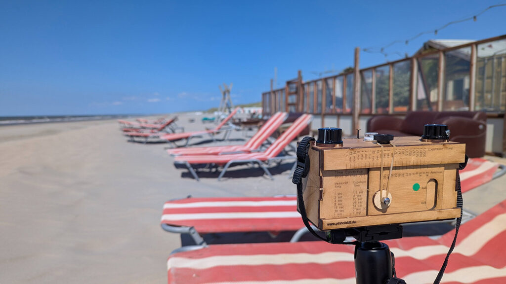 Bei der analogen Fotografie und ganz besonders bei der Fotografie mit der Kamera Obscura gehen immer wieder Dinge schief. In diesem Fall wurde ein Film in der Pinhole Kamera nicht straff genug aufgewickelt und beim Öffnen der Kamera teilweise belichtet.
